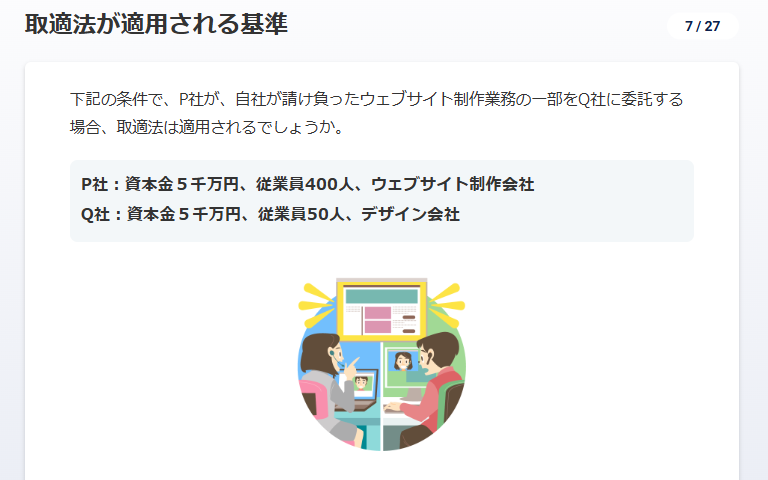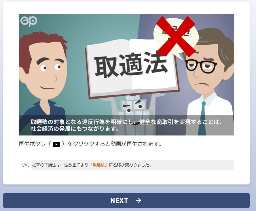 本eラーニングは2026年1月施行の中小受託取引適正化法(取適法/旧 下請法)に対応した教材です。改正法施行に合わせ、ぜひ社内研修にご活用ください。