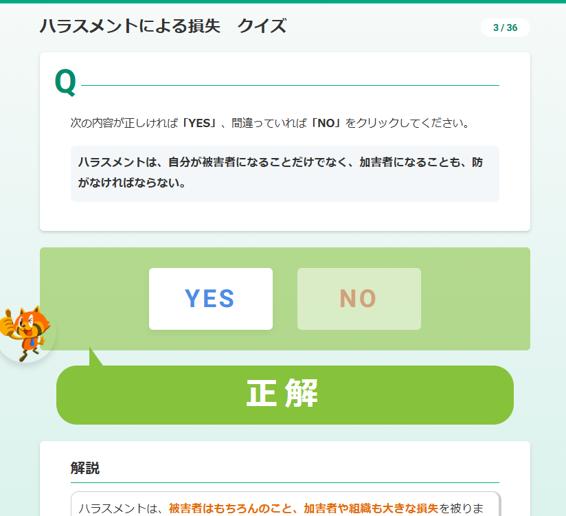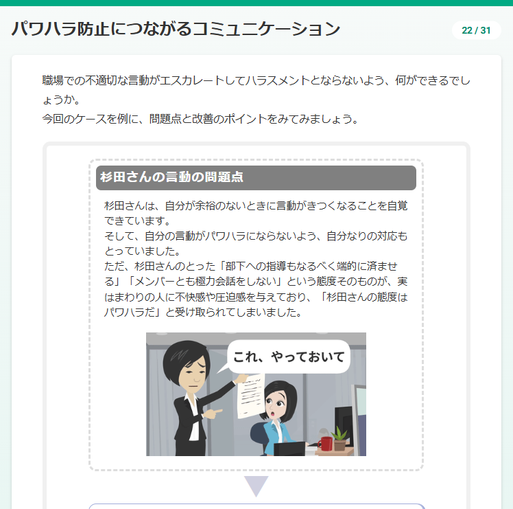 ハラスメント防止のためにまず重要なのは、どのような行為がハラスメントにあたるのかという知識を全社員で共有することです。そのうえで、組織の一員として、一人ひとりがとれる適切な対応を、クイズを通して学習していきます。本研修を通じて、ハラスメント防止を「自分も含めた、組織全体で実現していくこと」と捉えられるような内容にしています。