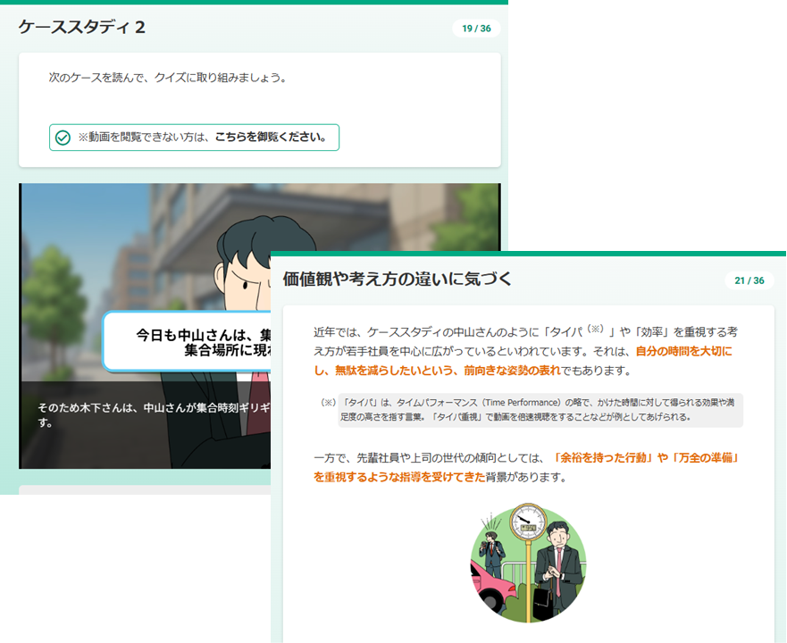 行為者本人がハラスメントだと気づきづらい、「グレーゾーンのハラスメント」について学習できる内容を盛り込んでいます。たとえば、集合時間に対する考え方の違いが関係性を悪化させてしまうケーススタディなど、ビジネスシーンでありがちな事例を通して、ハラスメントが起きづらいコミュニケ―ションについても学習できます。インシビリティや「アクティブ・バイスタンダー」のような、ハラスメント防止のために知っておきたい概念についてもしっかりと押さえています。