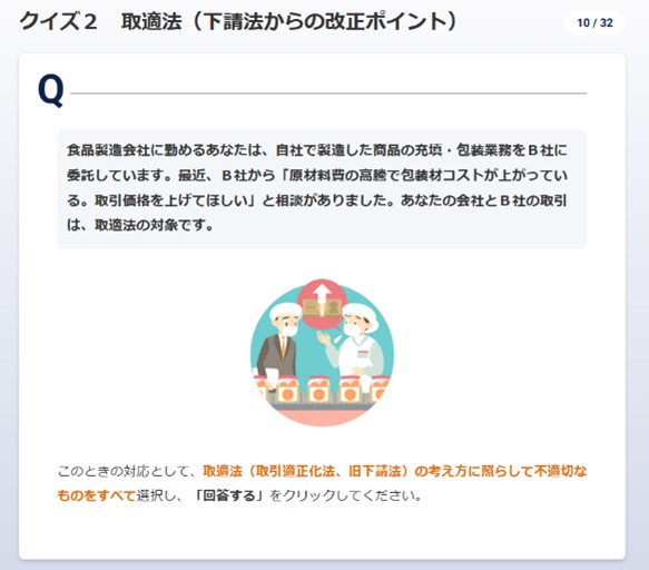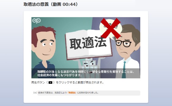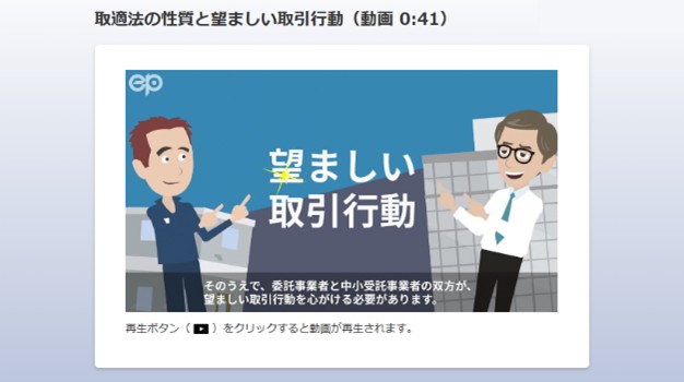 「なぜ今、取適法なのか?」という背景や、望ましい取引行動を動画で学び、法令遵守の意識を高めます。