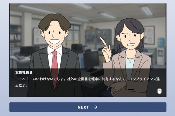 ビジネスシーンに即した設定のクイズを通して、受講者は能動的に考えながら学習。丁寧な解説で理解を深められます。